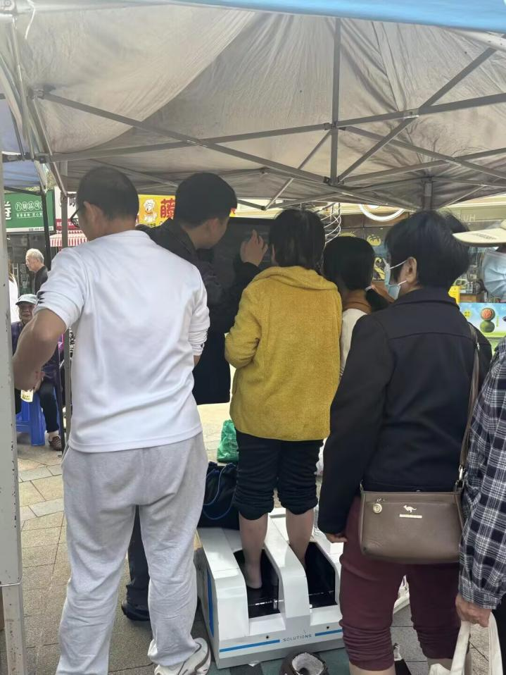 本次活动还特别联合李宁体育公司为老年人开展足部测量服务,为老人免费检测足弓、足底压力、步态特征及支撑情况,并结合体重数据提供个性化护足建议、穿鞋指导与步态改善方案。